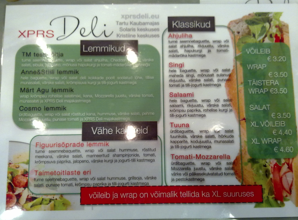 We entered Kaupsi, as the locals call the mall, and went to the side entrance to XPRS Deli. An attractive little corner kiosk, I had high hopes. It’s an Estonian chain, but you won’t find the Tartu XPRS on your GPRS, or GPS or whatever the acronym is. It’s so new they haven’t even updated their webpage yet.Not that it’s a problem for me, but the menus are only in Estonian. Even on the webpage, which says in Estonian, “The best chef is you—make your own sandwich!” That’s cool. But for most people in Estonia, a võileib, or sandwich (literally “butter bread”) is still an evolving food.